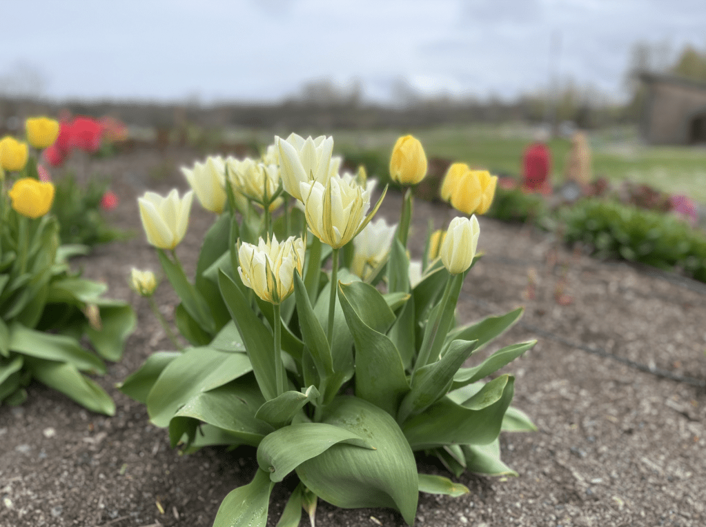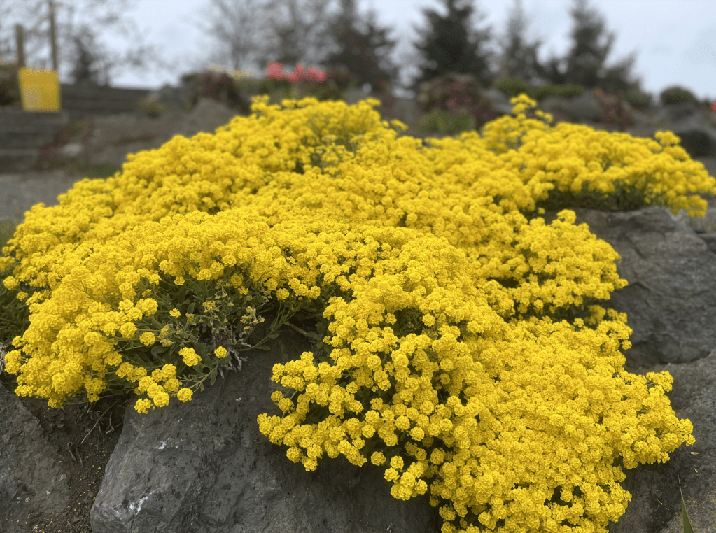 In early April, I visited the Sequim Botanical Garden at Carrie Blake Park for their Work and Learn party. The tiered hillside was covered in showy blooms and even though it was sprinkling while I was there, the work party was lively and friendly.